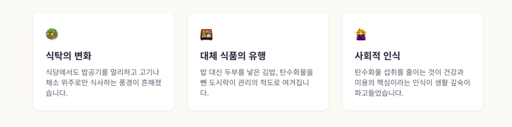 일상에서 탄수화물 섭취를 극단적으로 제한하는 방식은 이미 대중적인 식습관으로 자리를 잡았습니다. 점심시간 직장 근처 샐러드 전문점은 늘 만석이며 밥 대신 두부를 넣은 김밥이 팔립니다. 회식 자리에서도 볶음밥을 생략하는 것이 관리의 척도로 여겨지는 분위기가 형성되었습니다.