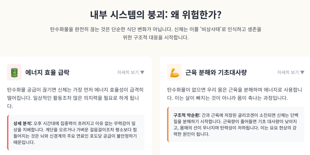 ✅ 결론 결국 탄수화물 섭취를 완전히 중단하는 행위는 신체 시스템의 구조적 붕괴를 초래하여 장기적인 건강 유지와 체중 관리를 방해하는 환경을 만듭니다.