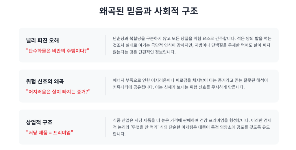 탄수화물을 모든 질병과 비만의 절대적인 주범으로 규정하는 시각이 널리 퍼져 있습니다. 단순당과 복합당을 구분하지 않고 모든 형태의 당질을 위험 요소로 간주하는 오해가 존재합니다. 적은 양의 밥이나 빵을 먹는 것조차 다이어트의 완전한 실패로 여기는 극단적인 인식이 강합니다.