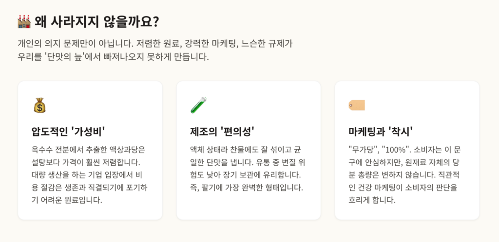 결국 주스 소비를 통한 액상과당 섭취는 개인의 기호 문제가 아니라 식품 산업의 구조와 인체 대사 시스템이 충돌하며 발생하는 사회적 현상입니다.