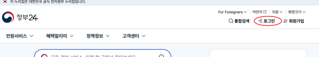 1. 정부24 공식 홈페이지에 접속하여 로그인을 진행합니다.