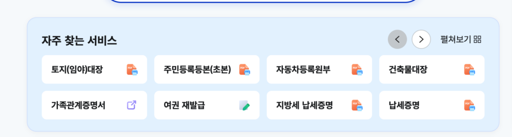 2. 메인 검색창이나 자주 찾는 서비스의 원하는 서류의 명칭을 입력 or 선택합니다.
