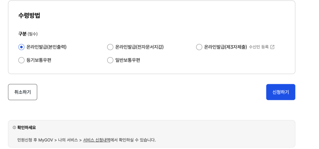 정부24의 모든 서비스는 ‘로그인 → 서비스 검색 → 신청서 작성 → 본인 인증 → 수령 방법 선택’의 흐름을 따릅니다. 간편인증이나 공동인증서가 있으면 비회원보다 훨씬 넓은 범위의 서류 발급이 가능합니다. 모든 서류는 신청 전 본인 확인 절차를 거치며, 결과물은 PDF 저장이나 프린터 출력을 지원합니다.